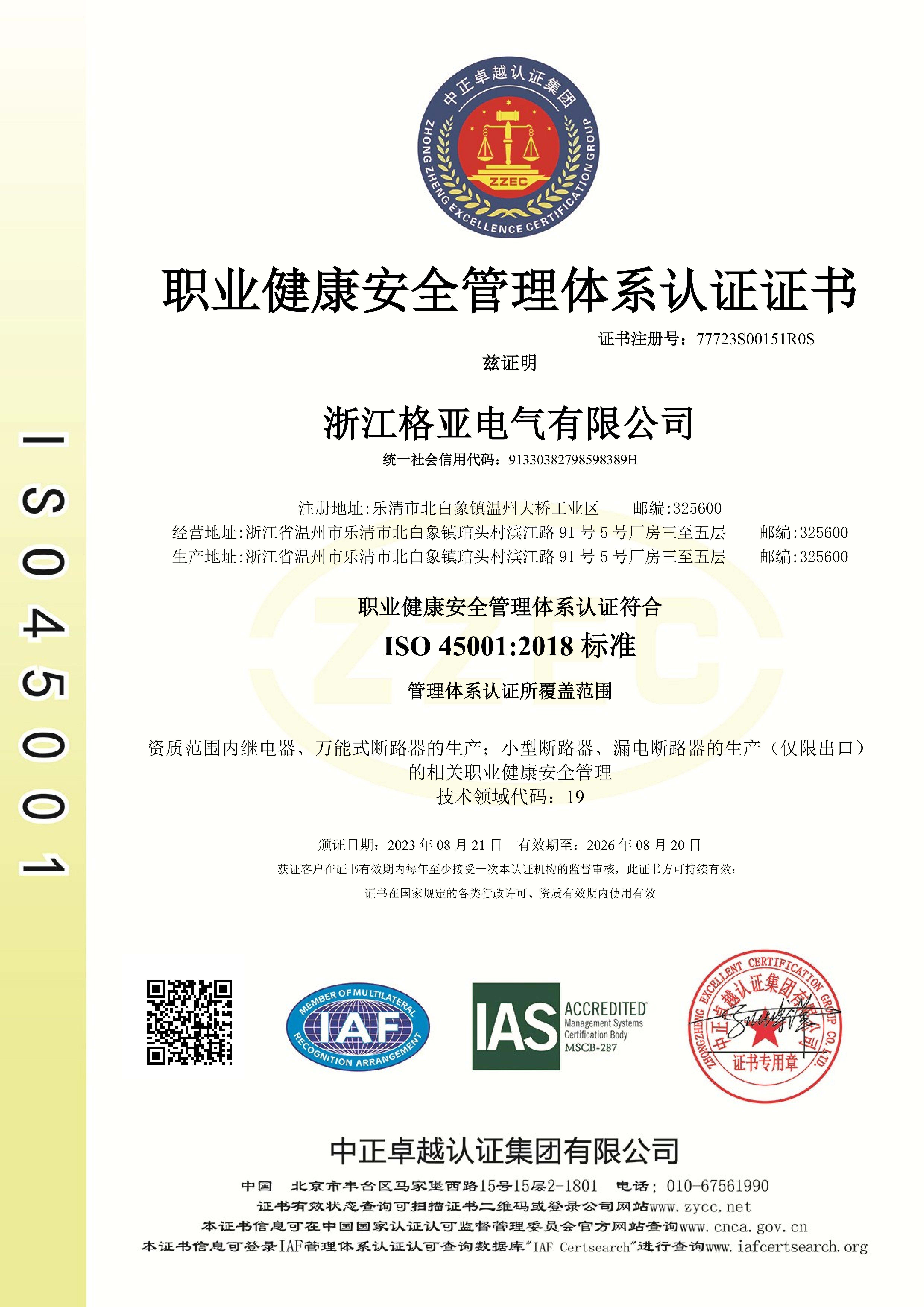 ISO 45001 職業(yè)健康安全管理體系證書 中文