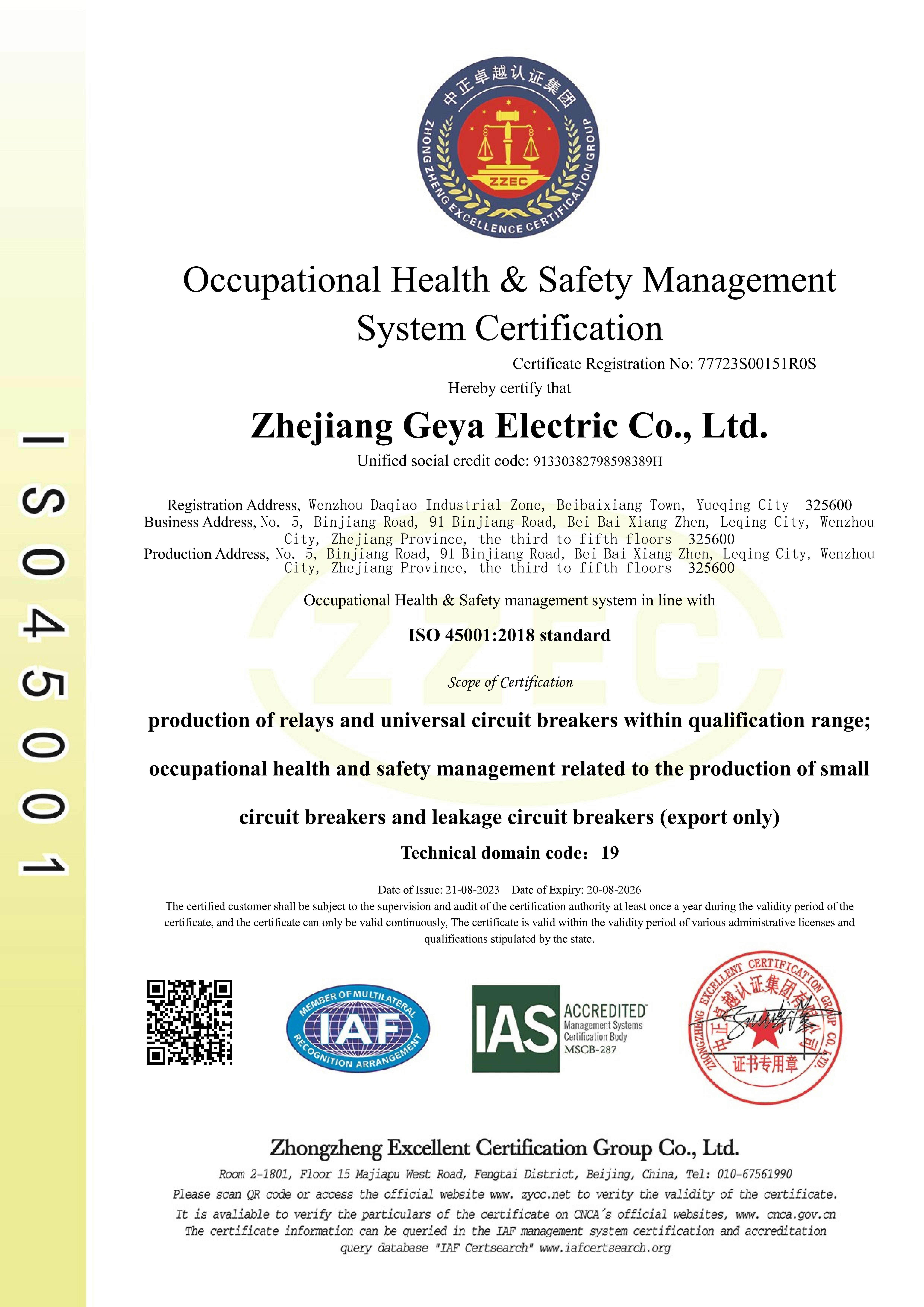 ISO 45001 職業(yè)健康安全管理體系證書 英文